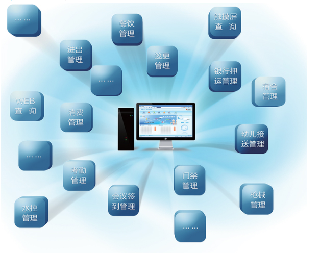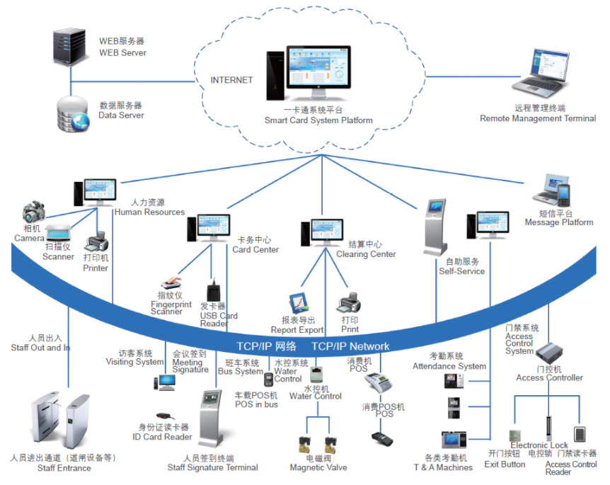 系統(tǒng)以一卡通管理系統(tǒng)為核心,通過網(wǎng)絡(luò)連接各功能模塊構(gòu)成系統(tǒng)的基本框架,由于系統(tǒng)按模塊設(shè)計(jì),可根據(jù)管理和發(fā)展的需要量體裁衣,分步實(shí)施,任意增減功能和擴(kuò)充規(guī)模。
